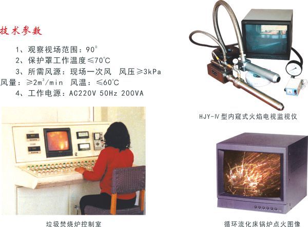 HJY-Ⅳ型內窺式火焰電視監視儀是用于監測爐內照度較低的循環(huán)流化床鍋爐及垃圾焚燒爐爐內物料狀態(tài)的彩色工業(yè)電視系統,該產(chǎn)品是我公司技術(shù)人員與光學(xué)研究所部分科技人員專(zhuān)門(mén)針對循環(huán)流化床鍋爐和垃圾焚燒爐而共同開(kāi)發(fā)研制的,只要光照度大于10LUX的環(huán)境條件即能清晰成像,在國內處于領(lǐng)先地位。對于循環(huán)流化床鍋爐,因為爐內為密封狀態(tài),在點(diǎn)火及投料過(guò)程中極易造成高溫或低溫結焦,而爐內照度又很低,用國內現有的爐膛火焰監視裝置看不到爐內物料狀態(tài)。如采用HJY-Ⅳ型產(chǎn)品可看到爐內物料狀態(tài)并指導投料并及時(shí)發(fā)現結焦趨勢,從而避免結焦或投料過(guò)多造成點(diǎn)火過(guò)程中滅火。而垃圾焚燒爐,由于污染問(wèn)題,爐體為密封式,投料后極易將火壓滅,即使在燃燒時(shí),爐內照度也非常低,通常在300LUX以下,而國內常規產(chǎn)品需在500LUX照度下才能工作。所以只有采用HJY-Ⅳ型產(chǎn)品,才能指導投料及探針插孔并在遠離現場(chǎng)的操作室內清晰看到爐內的垃圾焚燒狀態(tài),從而實(shí)現安全經(jīng)濟運行。